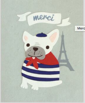 かわいいフレンチブルドッグがエッフェル塔の前で"merci" ありがとうと伝えてくれます。